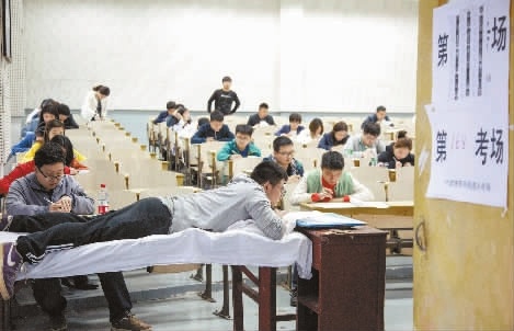 4月15日,全国高等教育自学考试太阳城娱乐考点,考生刘棠在专用考位上卧床参考。日前,刘棠在打球时不慎导致脊椎压缩性骨折,不能直立静坐,只能卧床平躺。学校得知这一情况,考务组在考场内设置专用考位,让他顺利完成了考试。 邓建平 蒋艳娟 摄