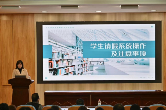 会上,学工处宋雅青老师就德育学分制如何实施落地、李璐老师就线上请销假系统操作办法作了解读分享。