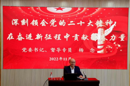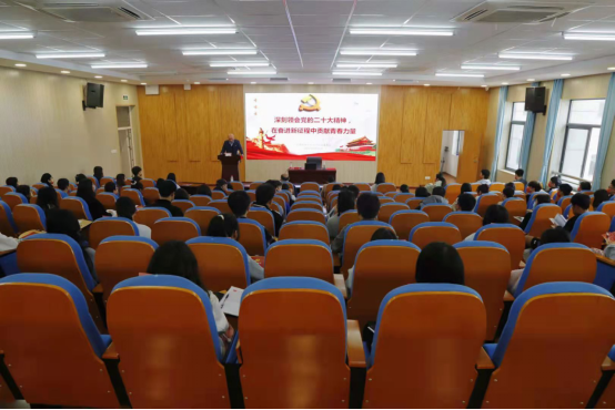 为深入学习宣传贯彻党的二十大精神,我校党委书记、督导专员杨念于11月25日在新综合裙楼D202为师生代表做宣讲。校党委副书记、副校长汪东明主持报告会,我校教工党支部书记与预备党员、发展对象、入党积极分子学生代表与会。