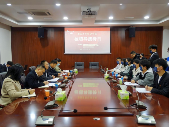 3月25日,由校团委、学生工作处主办、校学生会协办的我校本学期首个“校领导接待日”在综合楼A206举行,副校长鞠晨曦、学生工作处处长邝继红、物业公司总经理王琦认真倾听同学们的意见和建议,与同学们亲切交流,现场解决实际问题。