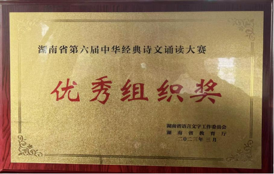 在2022年湖南省中华经典诵写讲大赛中,获本科生组《最后的自白》获一等奖,《月光下的中国》获二等奖,《永不消逝的声音》、《祖国,或以梦为马》获三等奖;《恰是百年风华》获教师组优秀奖。同时我校荣获“优秀组织奖”。共计,本科生组1个一等奖、1个二等奖、2个三等奖,教师组1个优秀奖,单位“优秀组织奖”1个。