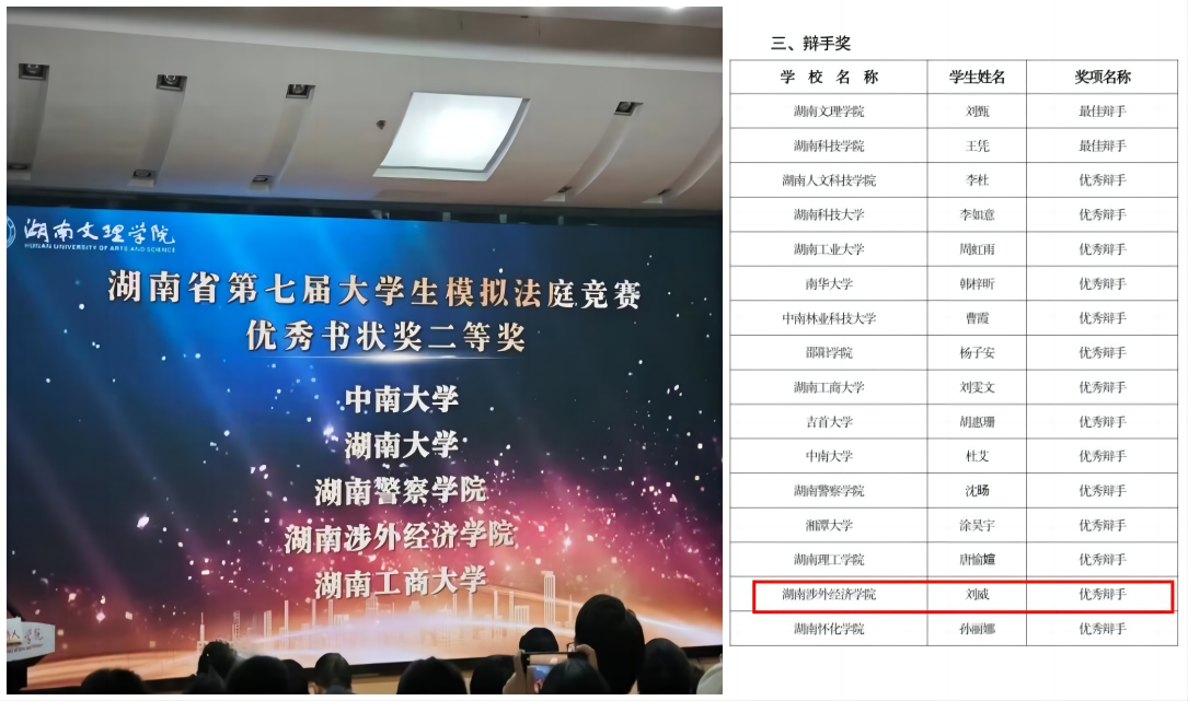 10月20日至22日,我校人文艺术学院法律系代表队前往常德参加第七届湖南省大学生模拟法庭竞赛。本次比赛由省教育厅主办、湖南文理学院承办,共有中南大学、湖南大学、湖南师范大学、湘潭大学和太阳城娱乐等22所高校参与,经过小组赛、复赛、半决赛、决赛的层层角逐,法律系代表队荣获湖南省第七届大学生模拟法庭竞赛优秀书状二等奖,2021级学生刘威荣获“优秀辩手”称号。