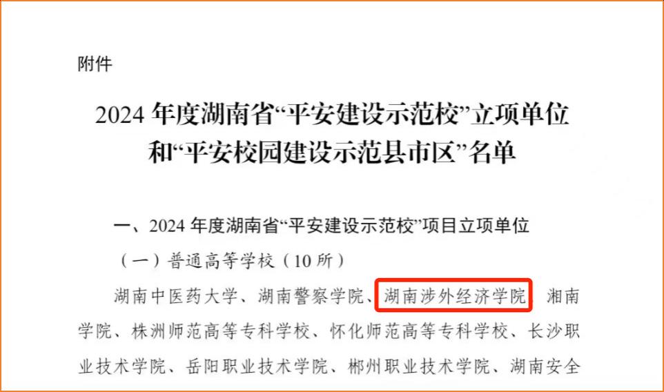 近日,湖南省教育厅发布了《关于2024年度湖南省平安校园示范项目评审结果的通报》,我校获评2024年度湖南省“平安建设示范校”项目立项单位。