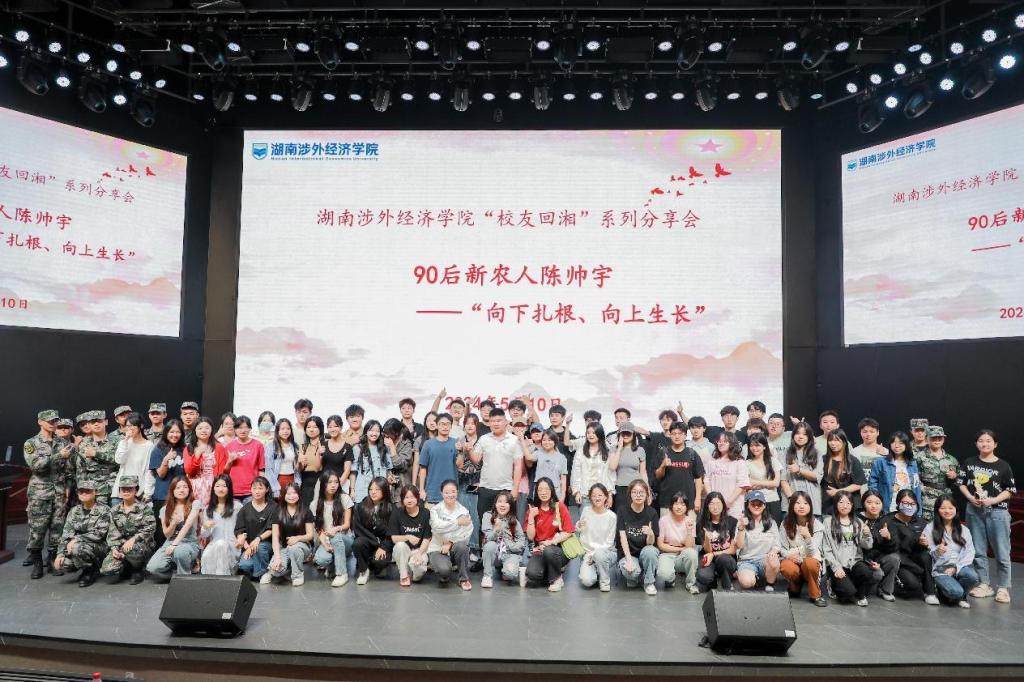 最后,陈帅宇校友结合亲身经历,为学弟学妹们带来了宝贵的人生寄语:要“吃得苦、霸得蛮、耐得烦;敢想敢干,不骄不躁;坚持认知,坚守初心;永远要相信美好的事情即将发生。”会后,现场学生与陈帅宇学长合影留念,共同记录下这难忘的时刻。