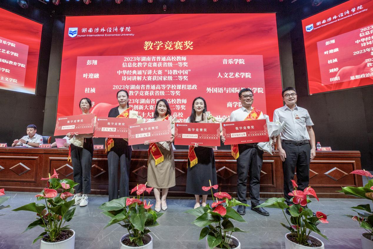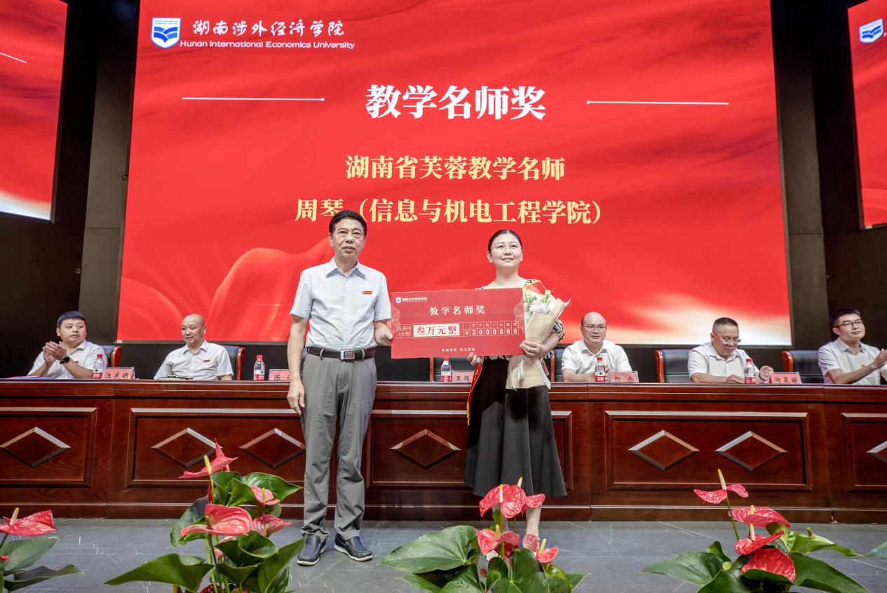 陈斌副校长公布2024年师德先进个人、教学建设奖、考研专项奖、优秀科研成果奖、教学竞赛奖、学科竞赛奖、教学名师奖的获奖名单。王耀中、杨念、王琦、鞠晨曦、高金定、汪东明分别为其颁奖。获奖代表刘熹颖分享“四个维度”对教学的理解,她表示,爱是教育基石,教师过硬的专业能力可更快为课程建设研究创新加持。获湖南省芙蓉教学名师的周琴深解“以德树人”的师规,严格要求自己,带领课程团队高质量完成学科研究,她强调,教师肩负育人使命,面对新时代,教育要不断教学提升,同时也要正确引导学生三观。