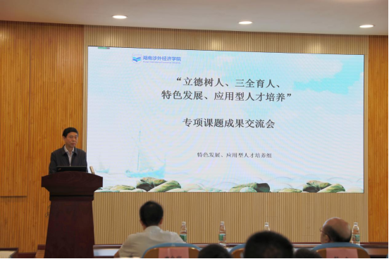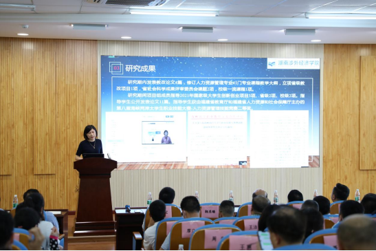 商学院副院长周奕指出,商学院人力资源管理系积极结合并响应湖南省三高四新战略、院校及专业特征、以及专业、院、校三级的创新创业教育资源再整合的需求,启动了应用型人才培养模式的研究,确立了“培养服务地方区域经济发展的高素质应用型专业人才”的目标。周奕先后向与会领导与教师介绍了课题组的研究背景、研究内容、研究成果以及存在的问题,让大家对人力资源管理系近年来在应用型人才培养模式方面的研究有了较为全面的了解。