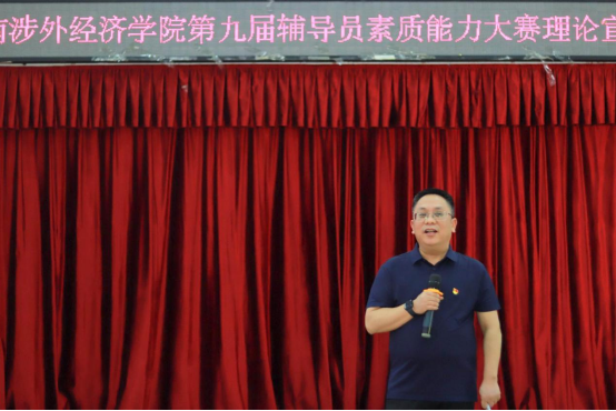 4月6日下午,由学生工作处主办的我校第九届辅导员素质能力大赛理论宣讲比赛在学术讲堂举行。学校副校长鞠晨曦、党政办公室主任邓青林、宣传部部长兼校团委书记戴薇、学生工作部部长邝继红、马克思主义学院副院长李故新出席并担任评委,各二级学院党总支书记以及全体辅导员观摩了本次比赛。