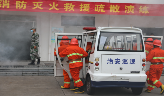 学生疏散过程中,学校微型消防站的6名消防队员接到火警指令后,迅速驾驶校园巡逻警车赶到现场,立即展开“搜救”与“灭火”工作。与此同时,高新区消防救援大队接到学校“火警”报告后,立即奔赴“火灾”现场。