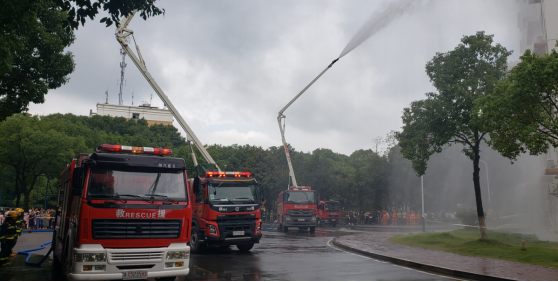 13时50分许,“火势”基本得到控制,现场指挥长命令虹桥中队对“起火点”继续出水灭火,雷锋中队、麓谷中队、东方红中队分别使用18米大跨度高喷车、云梯车进行灭火总攻。14时整,消防应急疏散逃生及灭火综合救援各项任务全面完成,演练圆满结束。
