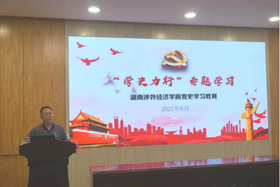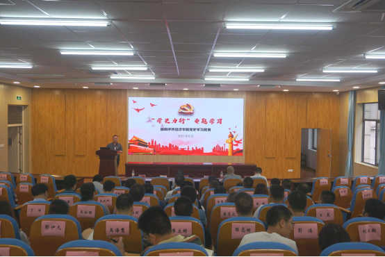 6月30日下午,校党委理论学习中心组围绕“学史力行”专题举行党史学习教育第四次集中学习。本次学习会由校党委副书记、副校长汪东明主持,副校长鞠晨曦作主题报告,在校校领导和各党总支书记、直属党支部书记、二级学院院长以及中层干部、部分教师党支部书记参加学习会。