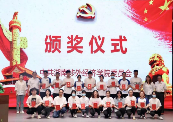 党政办主任邓青林、学工处处长邝继红、校党委组织部部长李琼和宣传部部长戴薇,为商学院在党史学习教育中表现优异的同学颁奖。