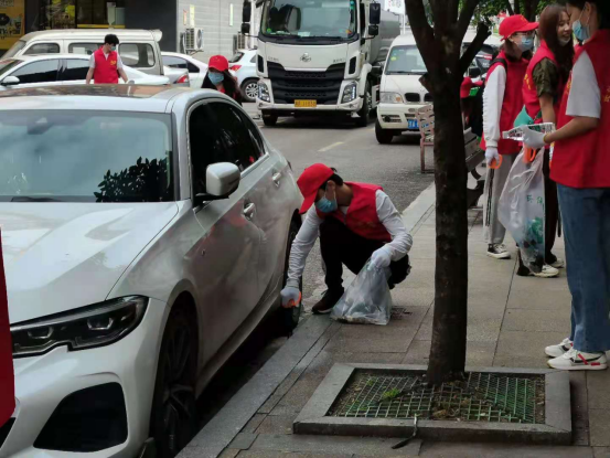 旗帜飘扬,胸带团徽、身着“长沙高新区志愿者”红马甲的志愿者青年们,和高新区城管执法大队的队员们,不惧烈日炎炎,一次次低头弯腰再起身前行。