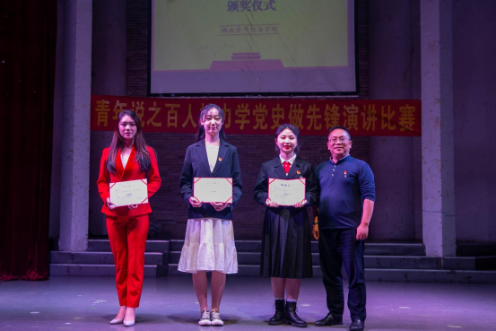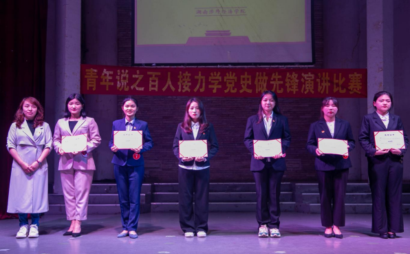 今年适逢党的百年华诞,为进一步激发我校师生对党史学习教育的热情,充分展示当代大学生爱党、爱国、爱社会主义的深厚情怀,4月29日,我校“青年说之百人接力‘学党史、做先锋’演讲比赛”决赛在世纪讲坛举行。出席本次活动的领导和嘉宾有:校党委书记柴世钦、副校长鞠晨曦、党政办主任邓青林、团委书记戴薇、学工处学生科科长田柳文、党委宣传部陈梦军、二级学院党总支书记以及外国语学院全体辅导员。