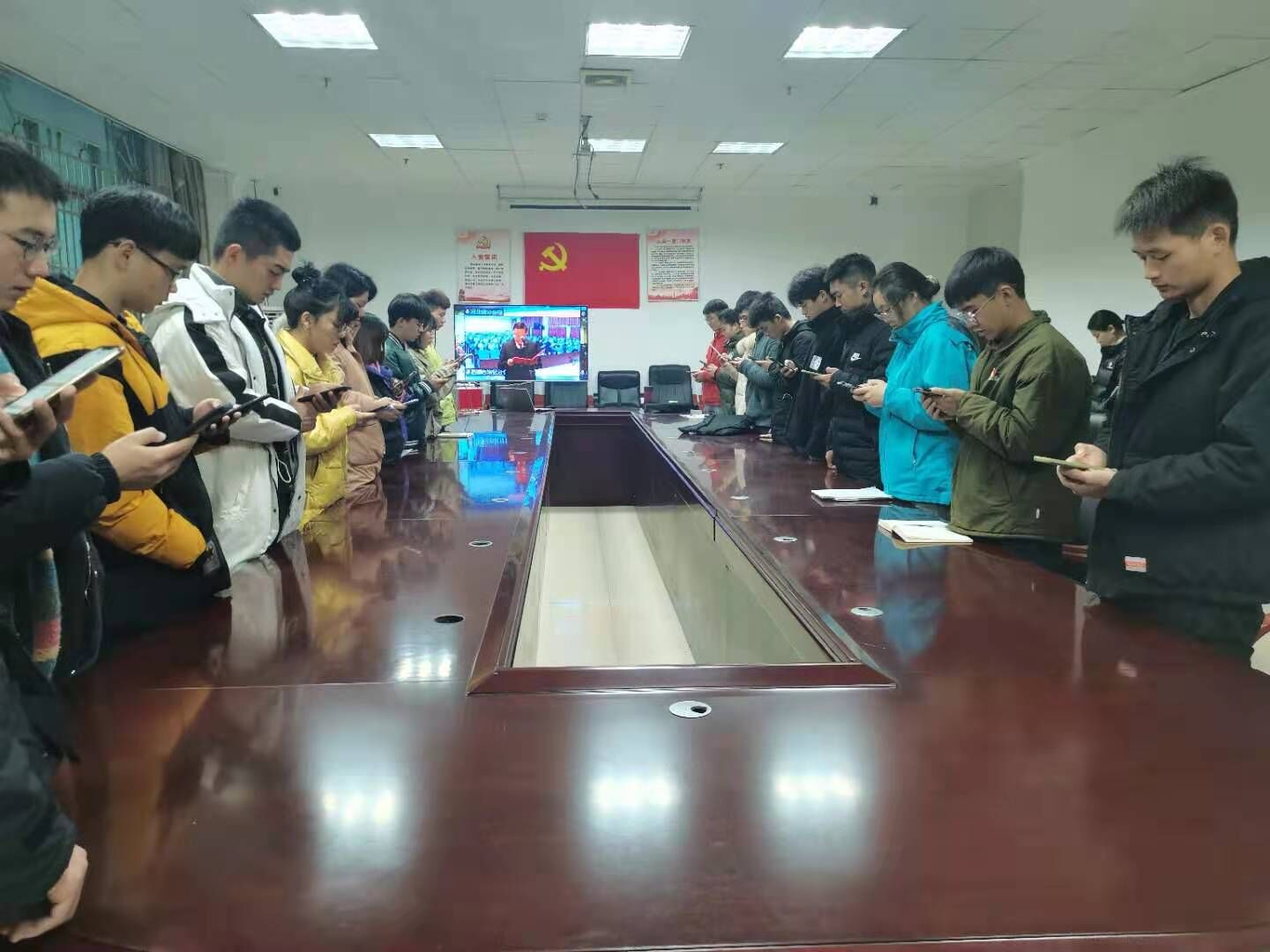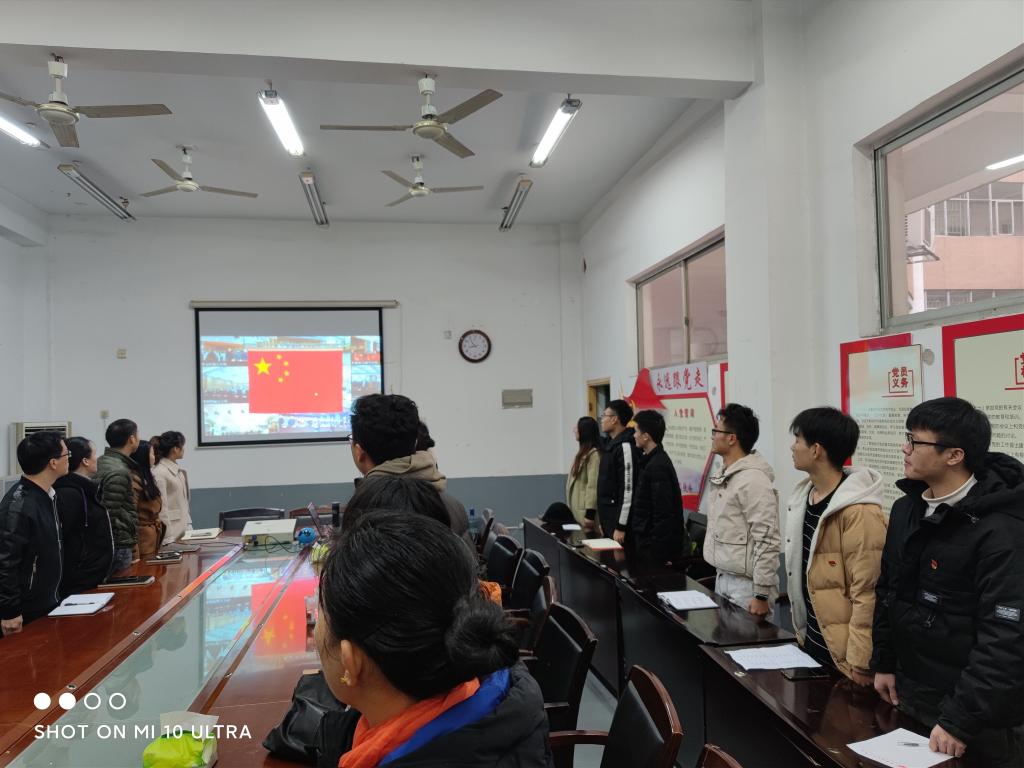 上午9点,来自校学生会、学生联、校团委组织部、校团委宣传中心的学生代表50余人齐聚一堂,通过全国青少年普法网收看直播,共同观看升旗仪式,齐唱国歌。
