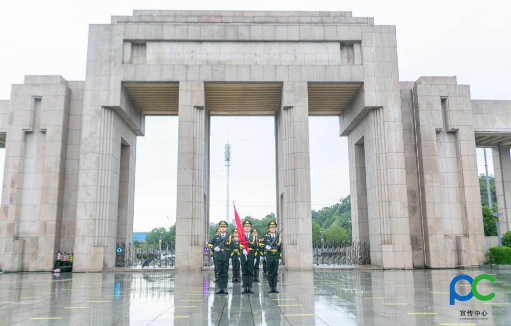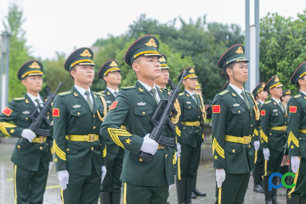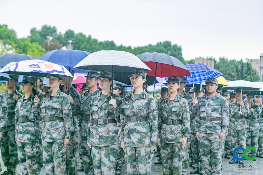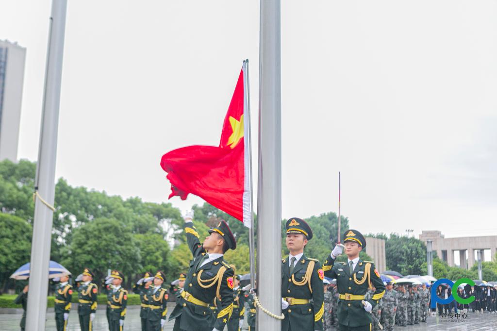 清晨微凉,细雨从天际绵延洒落,参礼者一早集合完毕,井然划分为两列,于升旗台下严阵以待。 7时整,我校学生志愿教导大队国旗护卫队从方阵队后方脚踏正步,迎国旗前来。他们身着礼装,动作整齐划一,步伐踩地而铿锵有力。在庄严而肃穆的氛围下,护旗手放飞国旗,国歌奏响,列队国旗台下的参礼者敬礼,鲜红的国旗在众人的注目中破开九月的薄雾,于风中猎猎升起。