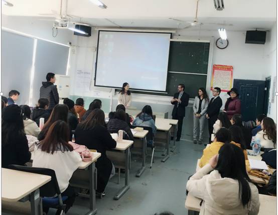 在国际合作与交流处陈善敏处长的陪同下,康普顿斯大学来访客人参观了外国语学院第五教学楼504教室。Babinger院长简单介绍了康普顿斯大学及此行目的后,与西班牙语专业师生进行了课堂互动。学生们分别就交换生项目、本科毕业去西班牙读研以及西班牙当地生活和学习情况等提出了一系列问题,Babinger院长一一解答,并对我校西班牙语专业刘宗珂、郭世博等多位同学的表现称赞不已,认为我们的学生语言流畅、表达清晰、思维活跃,已经具有良好的西班牙语水平。西班牙语系主任陈藜老师全程参与了课堂互动,陈子涵老师为来访客人做了现场翻译。