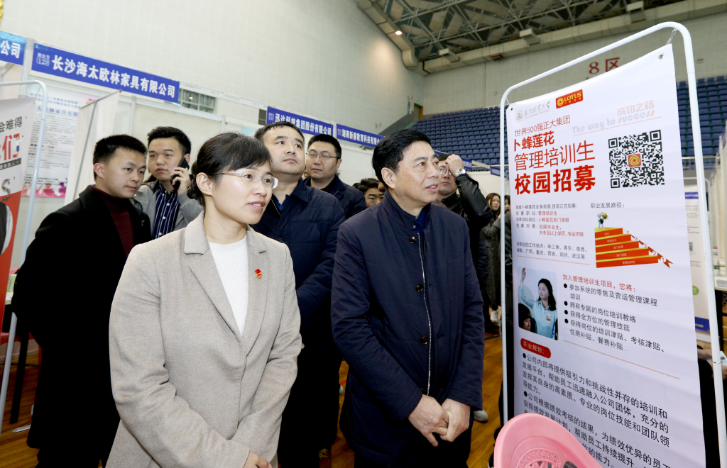 在平和堂(中国)有限公司、长沙市岳麓区卜蜂超市有限公司等单位的展位前,王耀中校长与陈斌副校长还与用人单位的招聘人员亲切交谈,了解其单位的人员缺口、岗位需求、薪资标准和福利待遇等情况。