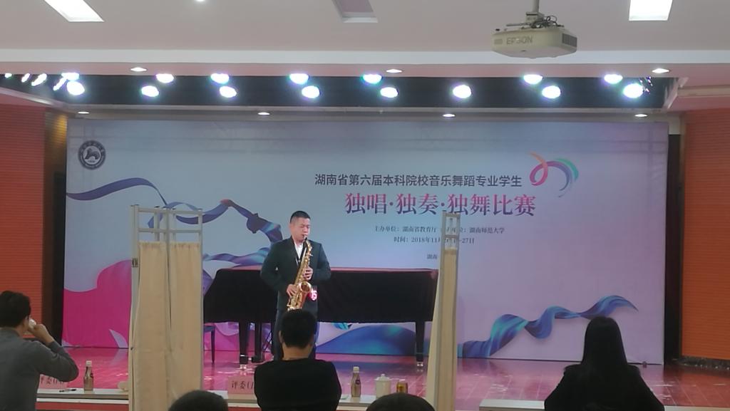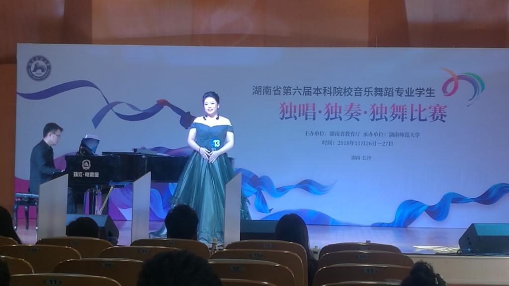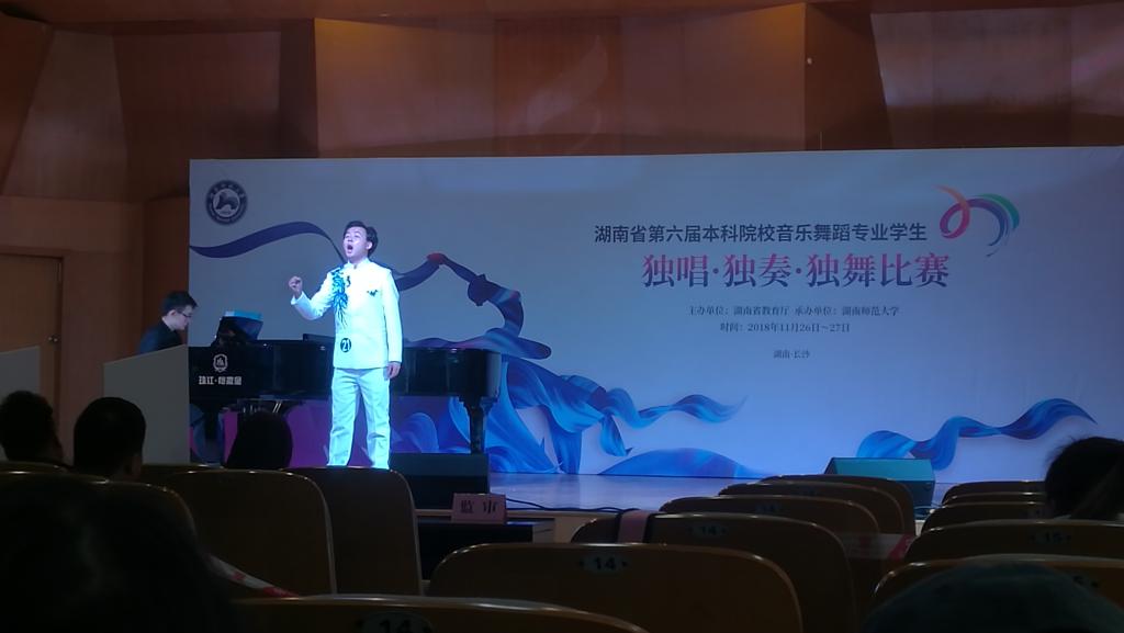 11月26-27日,由湖南省教育厅主办,湖南师范大学承办的湖南省第六届本科院校音乐舞蹈专业学生独唱、独奏、独舞比赛在湖南师范大学音乐学院举行。我校音乐学院经过层层选拔,最终选派了九名同学参加了独唱、独奏、独舞三个类别九个项目的比赛。