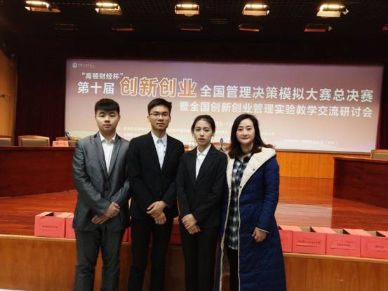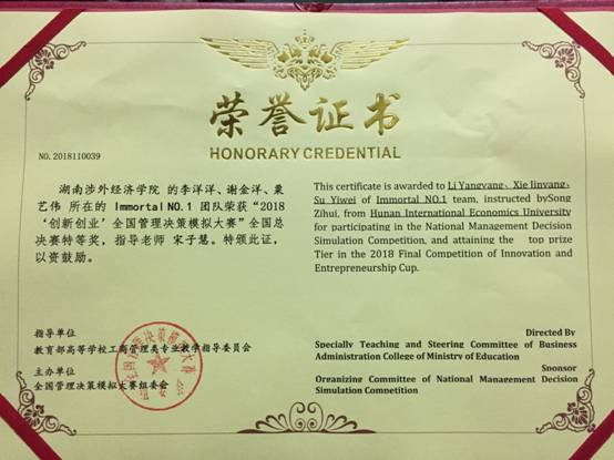 2018年11月11日,我校管理学院李洋洋、谢金洋、粟艺伟组建的“Immortal NO.1”队在宋子慧老师的指导下,喜获创新创业全国决策模拟大赛特等奖。管理学院以培养应用型人才为教学的宗旨,此项学科竞赛的成果正是这一宗旨的最好印证,也是学院大力支持的结果。