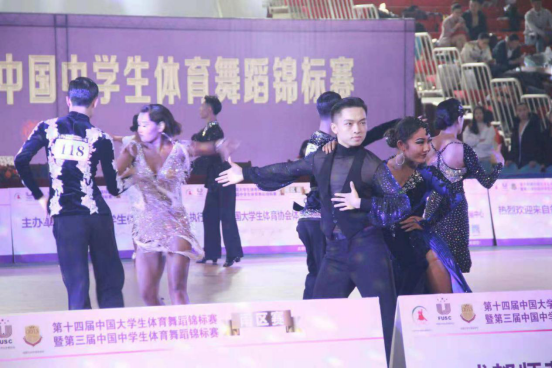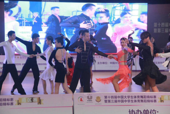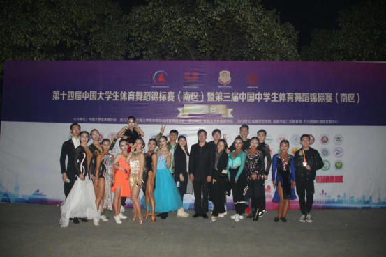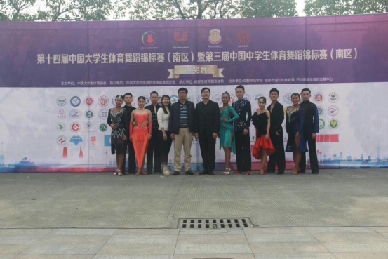 由教育部大学生体育协会、国家体育总局联合主办2018年第十四届中国大学生体育舞蹈竞标赛(南区)比赛于10月26--29日在成都师范学院圆满落幕,参赛单位包括来自成都体育学院、上海体育学院、武汉体育学院、四川传媒学院、西华大学、广东白云学院、湖北文理学院、中南大学、湖南农业大学、华中师范大学、湖南第一师范学院、昆明学院等全国80支高校队伍,近1200余名运动员参加了四个组别的比赛,赛事历时三天。我校派出了由刘雪勇院长任领队,唐红兵老师、刘伟老师任教练及16名体育学院表演系学生组成的体育舞蹈队参加了本次比赛。经过数日比赛,我校代表队不畏强手、奋力拼搏,在本次比赛中获得大学组单人L两项第一名、大学组专业B组两项第二名、大学组单人L两项第三名及其他奖项若干的优异成绩。