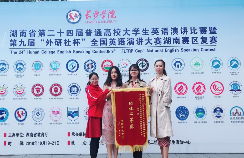 10月19日至21日,湖南省第二十四届普通高校大学生英语演讲比赛暨第九届“外研社杯”全国英语演讲大赛湖南赛区复赛在长沙学院举行。由我校新媒体与外语研究中心王惠老师指导的英语演讲代表队在本次比赛中成绩优异,荣获团体二等奖。其中英语专业组外国语学院方梓人同学荣获个人二等奖第一名,非英语专业组国际学院肖琪轩和童蝶同学荣获个人三等奖。
