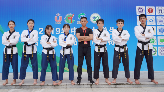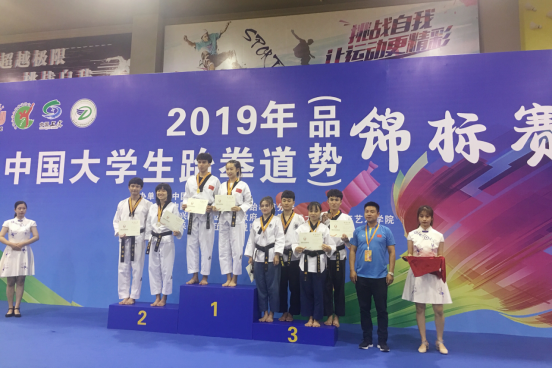 2019年全国大学生跆拳道(竞技)锦标赛于7.21—24日在湖南省岳阳市体育中心拉开帷幕,共有132所大学,1300余名运动员参加本次比赛。随后,2019年中国大学生跆拳道(品势)锦标赛于7.24—29日在杭州绍兴举行,共有77所高校770多名运动员,我校跆拳道队由体育学院刘雪勇院长担任领队,竞技项目由休闲体育罗建章主任、胡耀宗老师担任教练,品势项目由谢明院长、简志海老师担任教练,我校运动员顽强拼搏、奋勇向前,共取得一金四铜、四个第五名的好成绩,另外我校品势代表队获得“道德风尚奖”,简志海老师荣获“优秀教练员”奖,余珊获得“优秀运动员”奖,男子团体总分第四名,女子团体总分第六名,跆拳道舞蹈第七名。