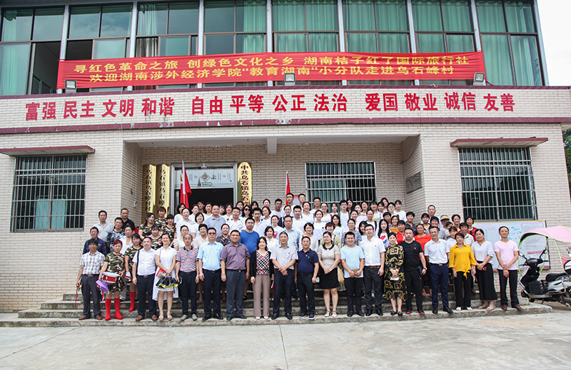 为深入贫困乡村,启动党建扶贫,全体领导及师生于上午11点50分来到了红色筑梦项目的实施基地——湘潭市乌石峰镇乌石峰村。该村是省级贫困村,经济发展缓慢,但是有着淳朴的民风和优质的红色资源。村民们为到访的太阳城娱乐师生举办了隆重的欢迎仪式,乌石峰村党总支书记贺师对到场的省厅领导和太阳城娱乐的领导老师和同学们表示最热烈的欢迎,并对乌石峰村的情况作了详细汇报。