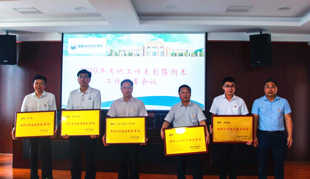 陈斌副校长宣读了《关于表彰2019届考研学生和考研先进工作单位的决定》,在2019年硕士研究生入学考试中,我校应届毕业生积极报考,刻苦学习,努力拼搏,取得了较好成绩,158人考取硕士研究生。其中36名学生被南京大学、中南大学、湖南大学等知名高校录取,52名学生前往英国爱丁堡大学、英国阿伯丁大学等高校攻读硕士学位。为表彰先进,根据《太阳城娱乐关于引导和鼓励本科生考研的若干意见(试行)》(湘外经院教字〔2018〕50号)的规定,经学校研究决定,对考上“985”、“211”学校研究生及出国(境)攻读硕士学位的88位学生每人奖励2000元,考上其他高校硕士研究生的70位学生每人奖励1000元。授予外国语学院和国际教育学院 “考研工作先进单位(综合)”荣誉,每个单位奖励5000元;授予商学院、体育学院和信息与机电工程学院 “考研工作先进单位(单项)”荣誉,每个单位奖励2000元;授予教务处、图书馆“考研工作优质服务单位”荣誉,每个单位奖励2000元。陈斌副校长代表学校希望获奖的各位学生戒骄戒躁,在新的高校潜心修学,再接再厉,再创辉煌,为学校争光。希望各二级学院及相关职能部门持续加大精力投入,最大力度为考研学生创造良好的条件、提供优质的服务,积极引导广大学生成长成才,不断提高我校人才培养质量。