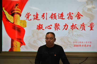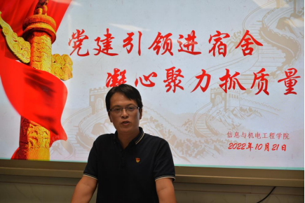 为全面推进“党建+宿舍”,通过党建引领助推学生宿舍精细管理,打造红色“家”文化,10月21日下午,我校信息与机电工程学院“党建引领进宿舍,凝心聚力抓质量”楼栋活动党支部动员大会于8教305室召开。信息与机电工程学院党总支书记唐志文出席、党总支副书记李祥林主持会议,各党支部成员、相关楼栋楼长参加会议。