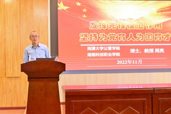 会议第一阶段,特邀湖南科技职业学院纪委书记周亮教授作辅导报告。周亮教授以“发挥先锋模范作用,坚持为党育人为国育才”为题,从“回眸党的发展历程、牢记党的性质宗旨任务、坚持党的教育强国战略”三个方面,结合党的二十大报告中党建工作要求,阐述了党支部书记履职担当的“三个自觉”以及党支部建设对服务青年大学生的重要意义。