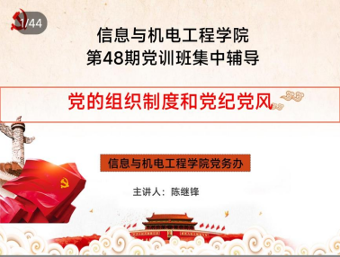 11月9日晚,我校信息与机电工程学院第48期入党积极分子培训班第四次专题党课“深入学习党的组织制度和党纪党风”于八教205和八教105正式开讲。本次党课由信息与机电工程学院院长陈继锋主讲,第48期全体入党积极分子参与学习。