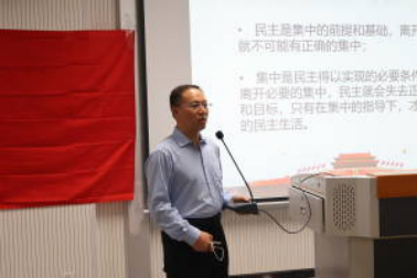 陈继锋从两个部分进行讲解。第一部分,陈继锋从“增强组织观念坚决维护党的团结统一”出发,解释了民主集中制的科学含义和民主集中制的基本原则,并介绍了党的组织机构,进一步引导学员们了解民主集中制,从思想上向党组织靠拢。
