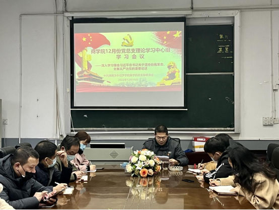 12月15日上午,我校商学院于二教115会议室召开了12月份党总支理论学习中心组学习会议,深入学习领会习近平总书记关于坚持自我革命、全面从严治党的重要论述,以坚定的自我革命精神把全面从严治党向纵深推进。会议由商学院党总支书记李向明主持,学院全体总支委员、支部书记、辅导员参加会议。
