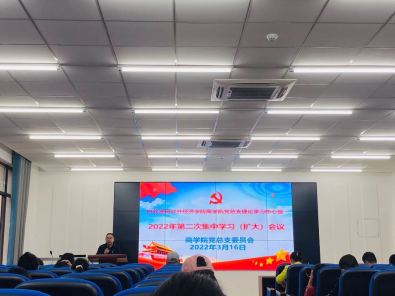 3月16日下午,我校商学院党总支在综合楼C315报告厅召开2022年第二次集中学习(扩大)会议。会议围绕学习贯彻习近平总书记重要讲话和全国两会精神进行专题学习研讨。会议由商学院党总支书记唐志文主持,全体总支委员、各支部书记以及辅导员参加会议。