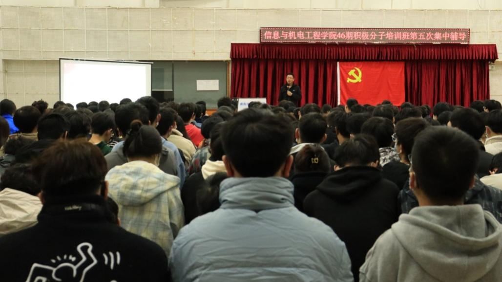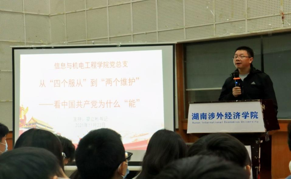 11月23日晚,信息与机电工程学院2021下半年46期积极分子培训班全体成员,于学术讲堂开展了主题为“从‘四个服从’到‘两个维护’看中国共产党为什么能”的党课学习,本次会议由信息与机电工程学院党总支书记廖立彬主讲。