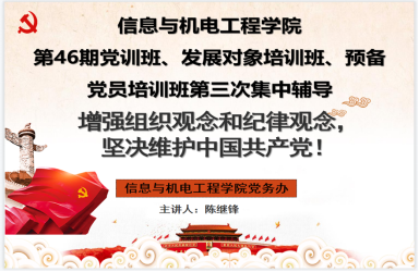 11月12日下午14:30,信息与机电工程学院党训班以线上形式在腾讯课堂开展“增强组织观念和纪律观念,坚决维护中国共产党”的主题党课,本次党课由信息与机电工程学院院长陈继锋主讲,全体46期党训班学员、预备党员、发展对象与会学习。