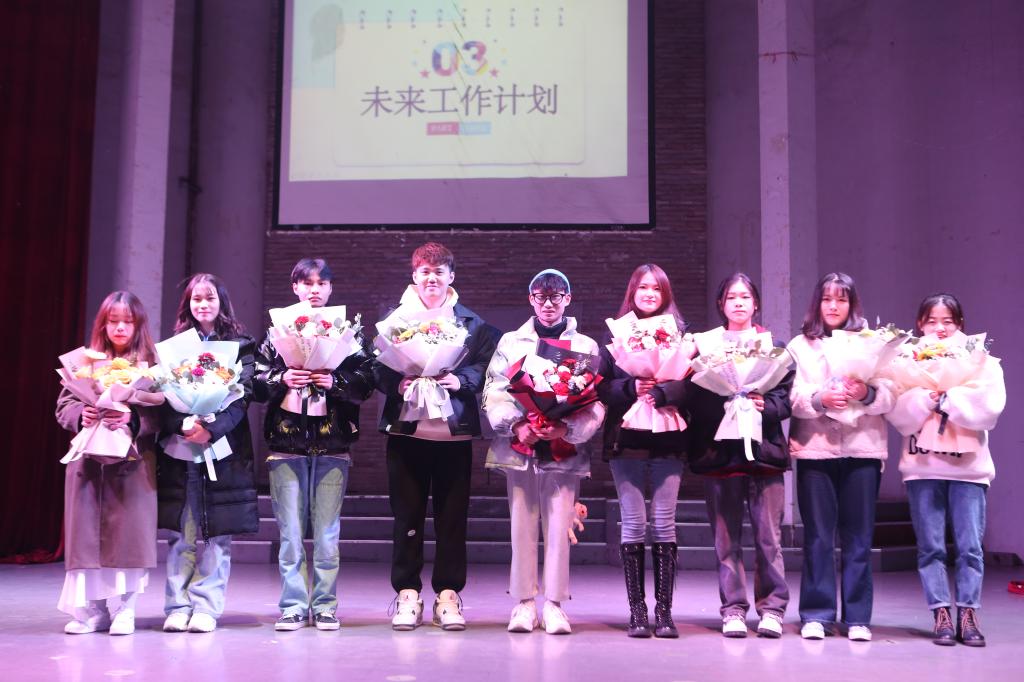 在第三环节中,团长阳宏志总结指出:“秉持着‘讲好校园故事,传播校园文化’的宗旨,在未来,新闻中心记者团将更加着眼于提升业务能力,写出更高质量的报道,做出更精彩的策划,拍出更好看的照片和视频;在收获工作经验的同时,也将继续传递温暖与关爱。”晚会终末,19级的记者为学长学姐们献上了美丽的换届花并合影留念,共同为记者团增添了又一份珍贵温暖的回忆。