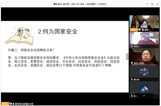 本次主题党日活动主要围绕“4.15全民国家安全教育日”学习国家安全教育知识,提高自觉维护国家安全的意识。主讲人姜美老师讲解了“4.15全民国家安全教育日”的相关知识,主要有以下五个方面的内容:1.国家安全教育日的设立背景、现实意义和法定义务;2.何为国家安全;3.危害国家安全的行为及相关罪名;4.如何维护国家安全;5.总结与感想。