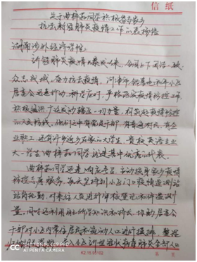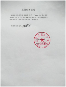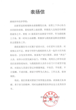 该学院重点表扬了陈梦、黎又嫡、袁嘉歆、李紫桐、张莉萍、谭香妙、朱雅琦、曲梓茹、廖艳芳、王典、段颖、唐家宁、曾海胜、成凰这十四位同学。他们有的在疫情最严重的湖北,如陈梦同学,在村委会组织下挨家挨户排查发烧情况,登记村民身体健康情况,指导村民们领取湖北健康码,勇敢无畏的精神让人感动;有的充分利用自己所学知识,在需要的岗位上贡献力量,如黎又嫡同学,照看因疫情无法按计划归国的汤加游泳队12人,每日进行两次体温测试并上传,提醒队员做好防护措施,安排一日三餐,安抚队员情绪,并承担现场翻译相关工作。还有的志愿接下了危险系数较高的工作,如成凰同学,承担了湖南省娄底市双峰县杏子铺镇飞云步步高的电梯间消毒工作。