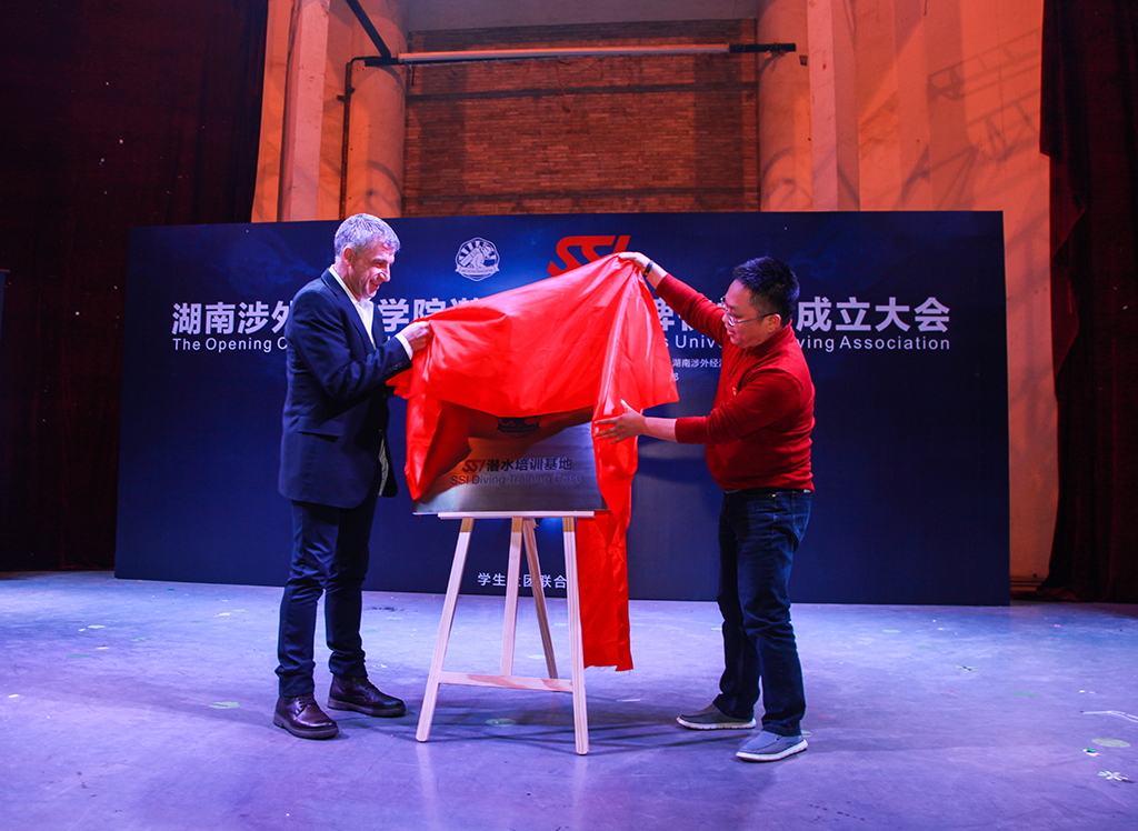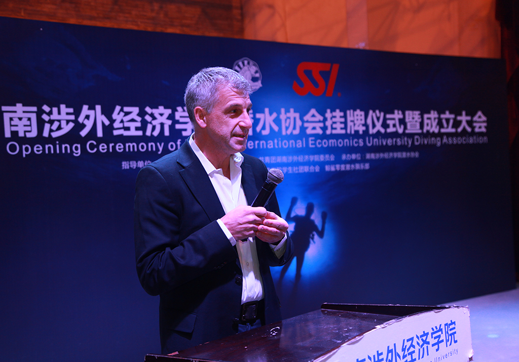 鞠晨曦副校长和SSI全球副总裁JC先生共同为我校潜水协会授牌,正式揭开了我校潜水事业的序幕。JC先生在英文致辞中表达了对协会的厚望,并代表SSI发表了系列讲话。鞠晨曦副校长指出:潜水不仅仅是一项运动,同时代表了每个人对人生的一种态度即对生命、对奥秘、对人与世界联系的追求与探索。每个人都应该要热爱生命,珍惜地球,拥抱大海。潜水协会会长付全杰做了协会规划报告,阐明了潜水协会的成立宗旨、基本任务,以及未来的发展方向。他希望通过他们的行动可以让更多的人了解到海洋保护以及生态环境的重要性。同时,他表明协会将会在SSI以及学校的领导下坚持正确方向,共图良好发展。太阳城娱乐优秀校友、优秀潜水教练刘昆先生为大家做潜水运动主题分享会,他通过幽默风趣的讲话和自己的亲身经历向在场人员普及了相关的潜水知识,并且用一系列海洋受到破坏的图片向大众传达了保护海洋生态环境特别是保护鲨鱼的迫切性。