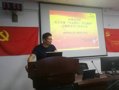 9月19日上午9:30,外国语学院九月份主题党日活动暨“不忘初心,牢记使命”主题教育动员大会在五教603隆重召开。副校长白解红、外国语学院院长姚佩芝、党总支书记李向明、外国语学院全体教工党员、辅导员和学生代表参加会议。学院党务工作联络员薛勇主持会议。