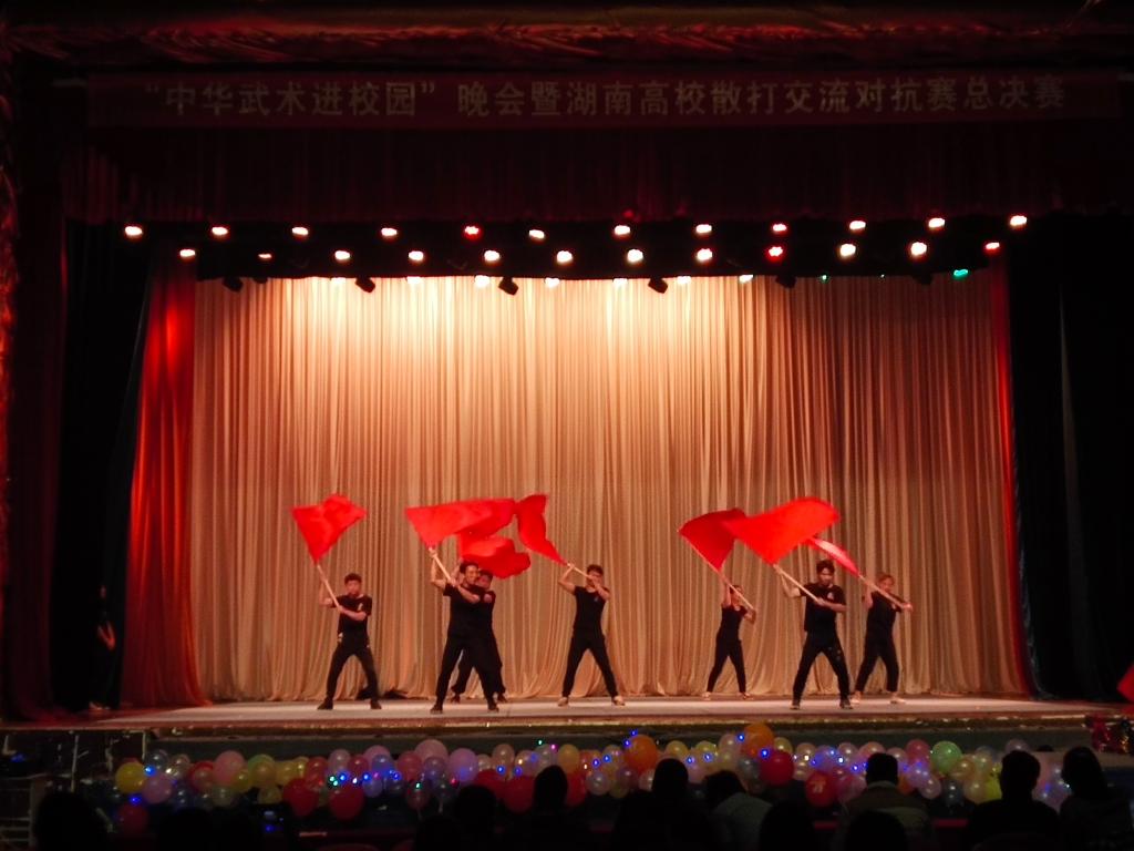 同日晚上7点30分,“中华武术进校园”晚会在体育馆热烈举行。晚会邀请到我校一马音乐社、书法协会等社团上台助阵,向外校展现出我校学子的风采。同时,外校代表湖南第一师范学院民舞协会也上台进行了精彩的表演。