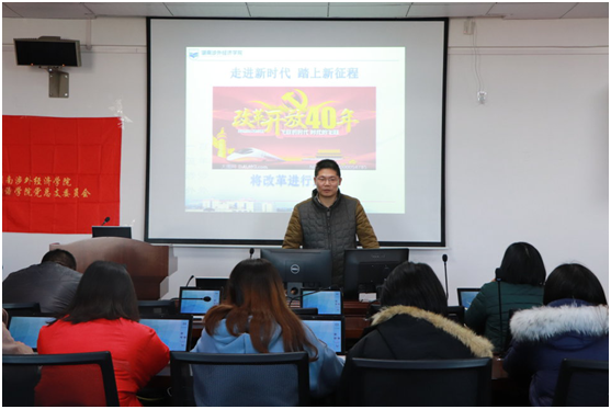 12月17日,外国语学院在第五教学楼603教室举行专题学习会,学习王耀中校长12月10日在全校2018下半年党员发展对象党课上的主题讲话《解读“改革开放40年”》。本次学习会由学院党总支书记李向明主持。外国语学院常务副院长姚佩芝博士、学院全体教工党员和学生党员代表参加了学习会。