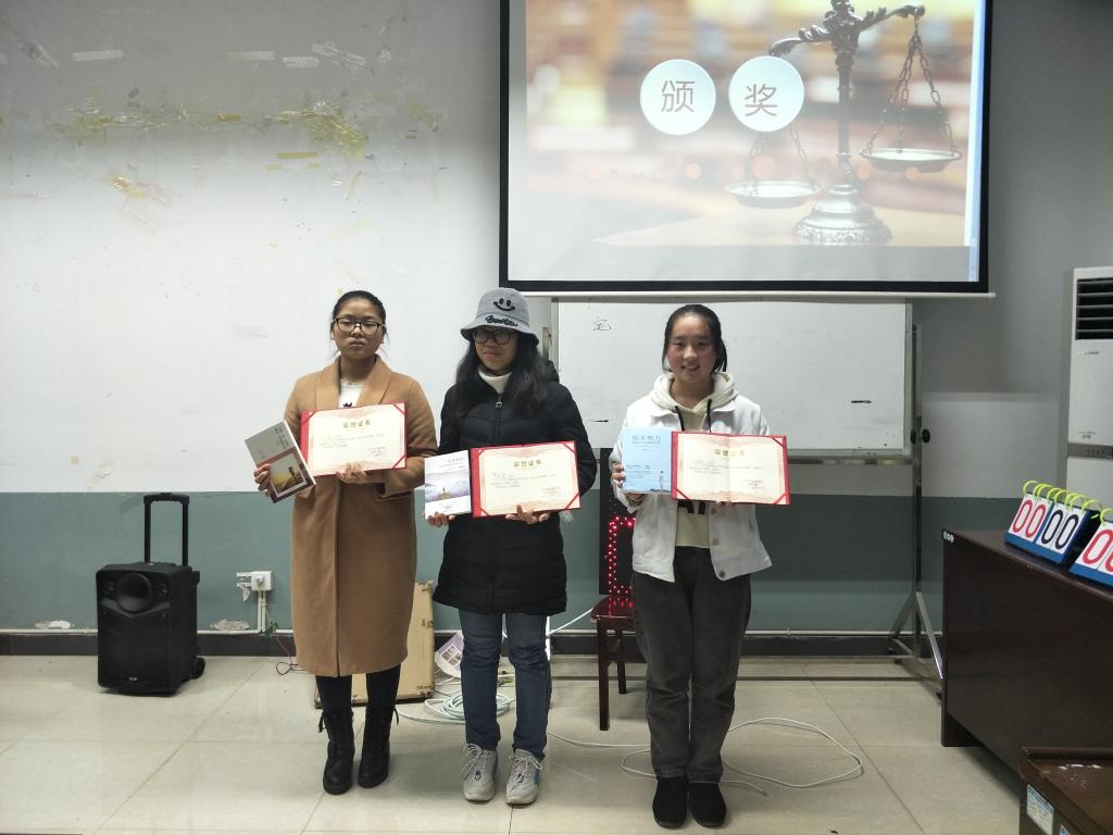 最终,来自法学1803班的代表队(蔡美莲、王晴、刘丽貌)以130分的成绩斩获比赛第一名,法学1802代表队(向馨、刘文洁、陈卜甜)以100分荣获第二名,文化产业管理1801班代表队(徐颖、邓颖琳、丁凤)以90分获得第三名。随后,大学生法律协会会长、副会长为其颁奖。知识作伴显青春朝气,法律护航谱美丽人生,此次比赛圆满落幕。