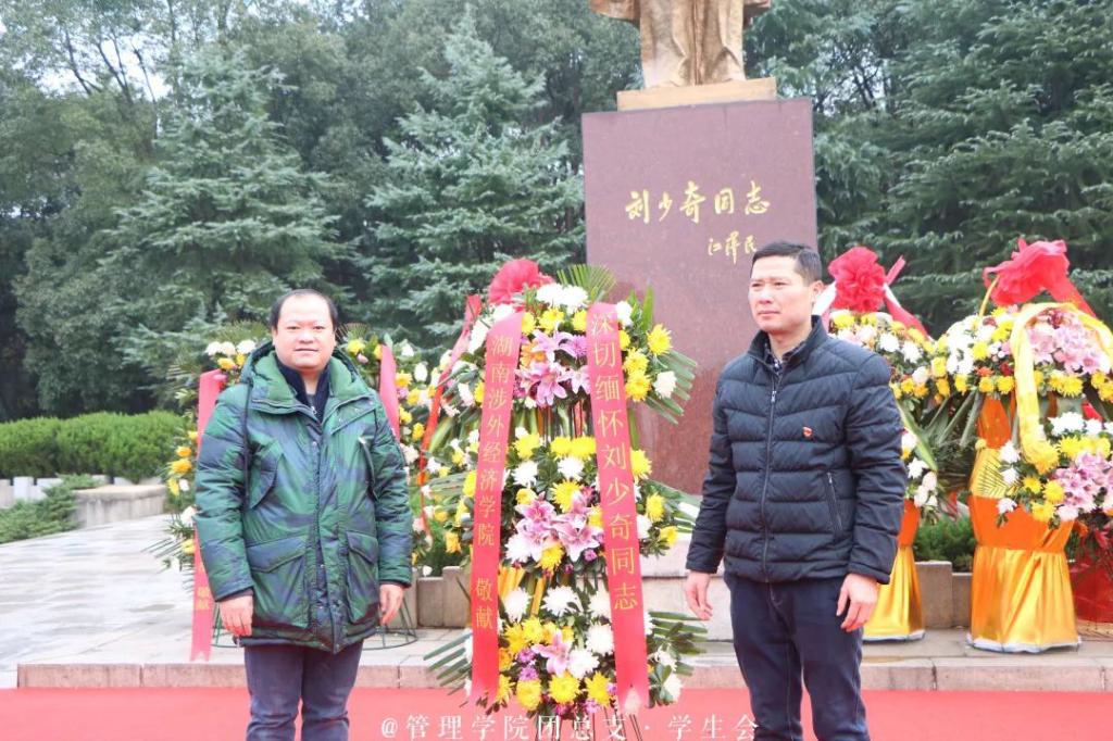 上午10点,全体党员在刘少奇铜像前敬献花篮,敬献仪式由刘少奇纪念馆工作人员主持。管理学院党总支书记吴九海、音乐学院党总支书记王治国代表全体成员在铜像前敬献花篮。