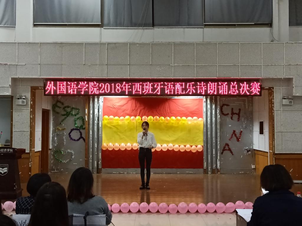 比赛伊始,鞠副校长说道,即使身为西语专业的门外人,他也依旧对朗诵总决赛充满期待,对西语未来的发展充满信心。经过层层筛选,最后共有9名参赛选手脱颖而出来到决赛现场。一号选手聂凯以一篇《致橡树》拉开了决赛的帷幕,通过木棉树对橡树的“告白”喊出爱情中男女平等的口号,发出了新时代女性的独立宣言,表达其对爱情的憧憬与向往。三号选手杨巧琪声情并茂地朗诵着《感谢生活》,让一个面对不公的生活依旧心怀感恩的女子形象映入观众眼帘。比赛的最后,17级带读队带来了西语版《白雪公主》的话剧表演,为此次竞赛画上圆满的句号。