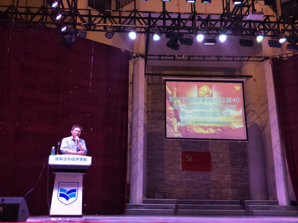 10月24日晚7点,党校外国语学院分校第40届入党积极分子培训班开学典礼暨第一次集中辅导课在世纪讲坛举行。本次辅导课分两个班进行,由外国语学院党总支书记李向明主讲,党总支副书记陈波主持,向学生们宣传党的思想理念和党的宗旨。