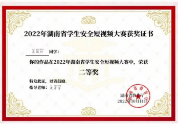 近日,2022年湖南省学生安全短视频大赛评审结果揭晓,经过激烈的角逐,我校人文艺术学院皮彦芳老师指导的、文化产业管理专业1901班吴国灯同学参赛作品荣获“湖南省学生安全短视频大赛”二等奖。