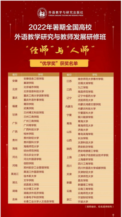 为鼓励认真学习的广大教师和积极组织教师参研、交流的院校,本年度研修班特别设置面向教师的“乐思奖”“乐学奖”“乐享奖”“乐评奖”和面向院校的“优学奖”与“优研奖”,以奖励为推进跨区域、跨校联动,协同提升育人成效所做的贡献。根据各院校累积参研学时,每个省份评选出2所院校获得“优学奖”奖励,10月25日晚公布了获奖结果,我校荣获2022年暑期全国高校外语教学研究与教师发展研修班“优学奖”。
