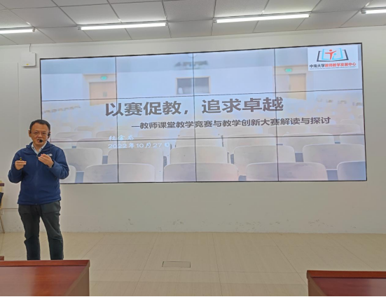 本次培训特邀中南大学“湖南省普通高校课堂教学竞赛一等奖”获得者杜金龙博士主讲,讲座的主题为“以赛促教,追求卓越—教师课堂教学竞赛与教学创新大赛解读与探讨”。杜金龙老师主要从课堂教学竞赛介绍、竞赛评审标准解读与关键问题解读三个方面展开,他强调,我们的竞赛课堂内容选择要有深度、教学呈现有温度、教学组织有宽度、知识讲解有高度、能力培养有难度、教学目标有达成度。他与参会老师一同探讨怎么在体现教学内容专业性、学术性、前沿性的同时,增强教学的趣味性,如何将创新元素与课程思政元素融入教学,现场教师踊跃发言,气氛热烈。